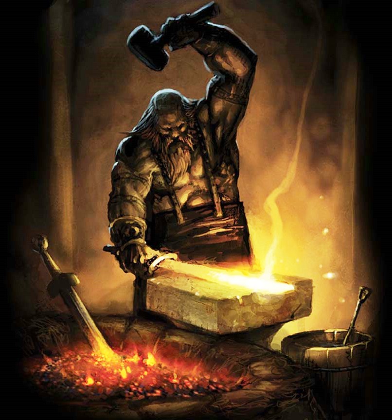 barba desaliñada y el pecho descubierto, inclinado sobre su yunque,